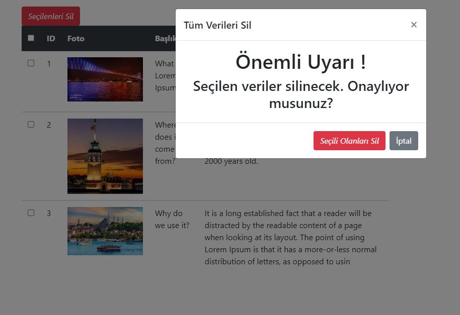 - Tüm Seçilenleri Silmesi için Modal Uyarı Butonu